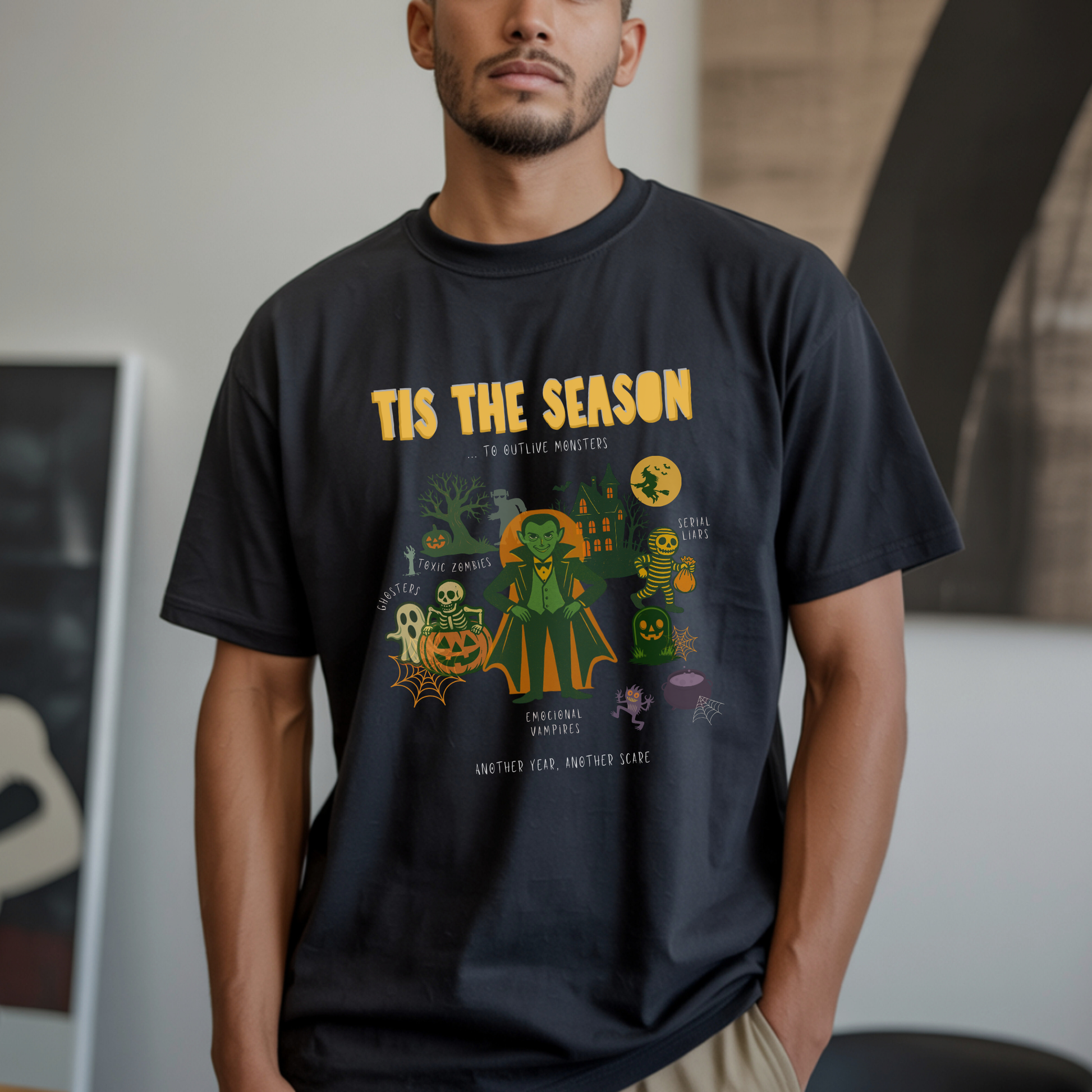 This Halloween T-shirt blends adulting humor with the challenges of grown-up life in a unique piece, made for those who already know the monsters lurking around and how to outlive them.